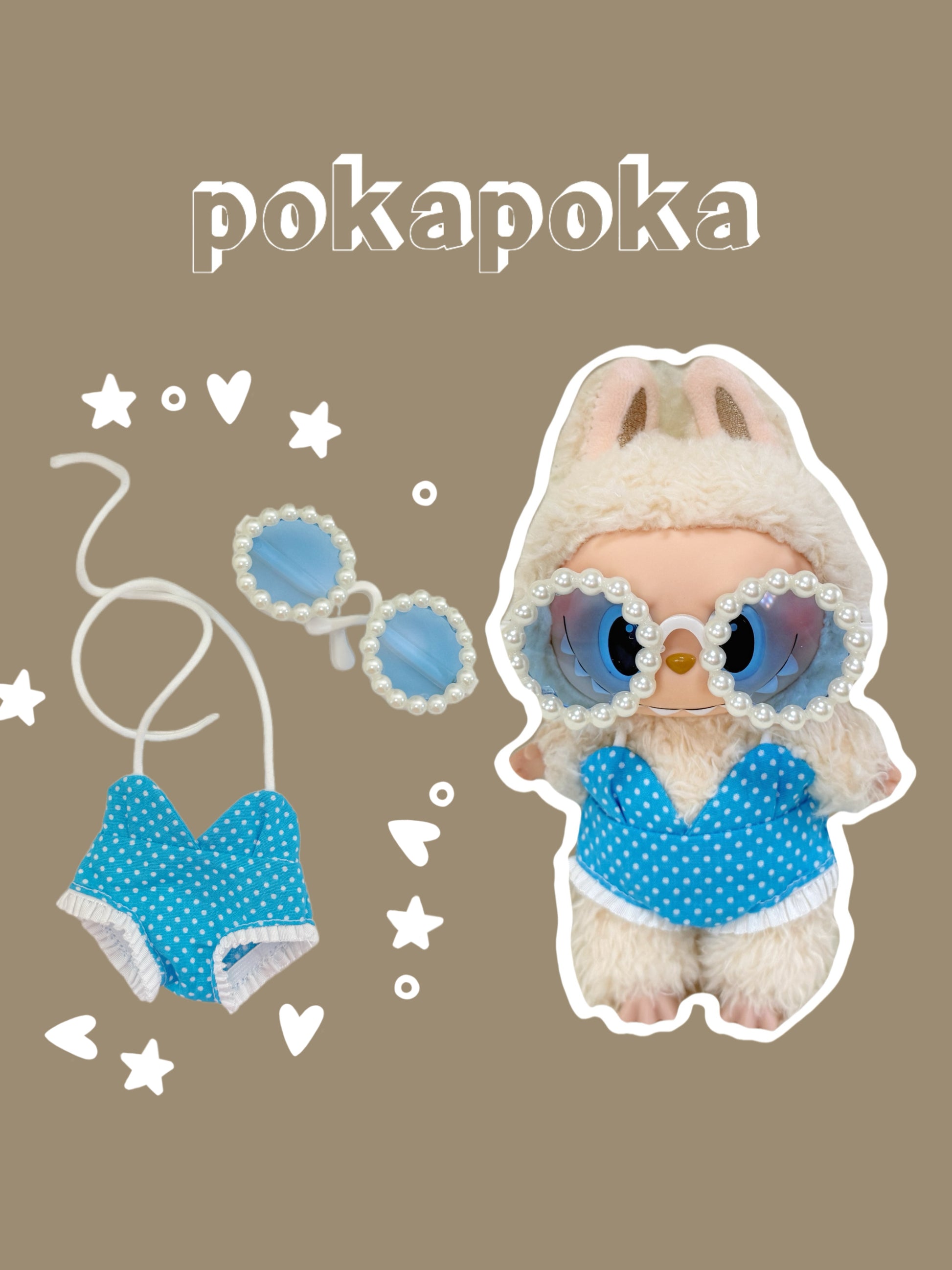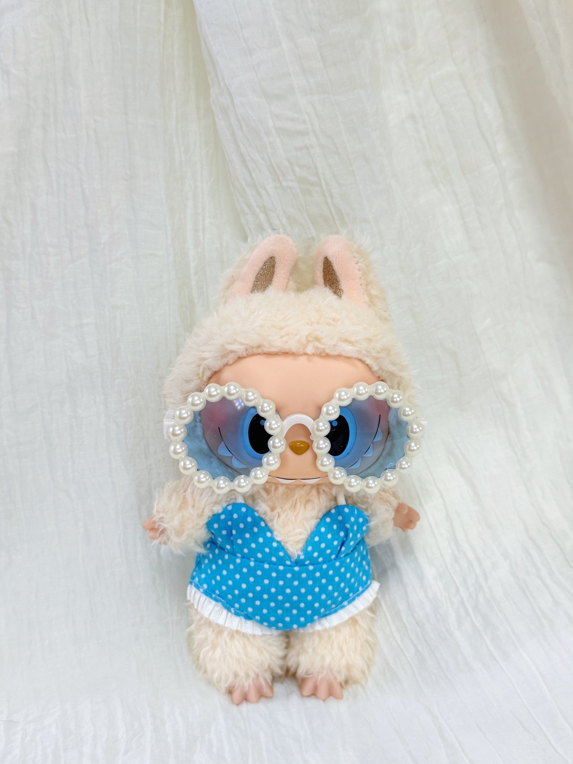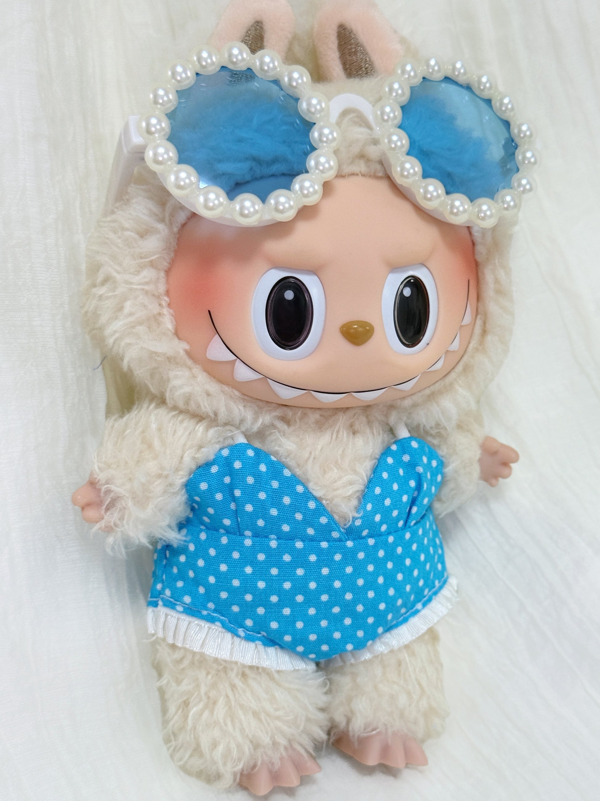 Labubu Swimsuit Clothes – Blue Polka Dot Bikini Look with Pearl Sunglasses