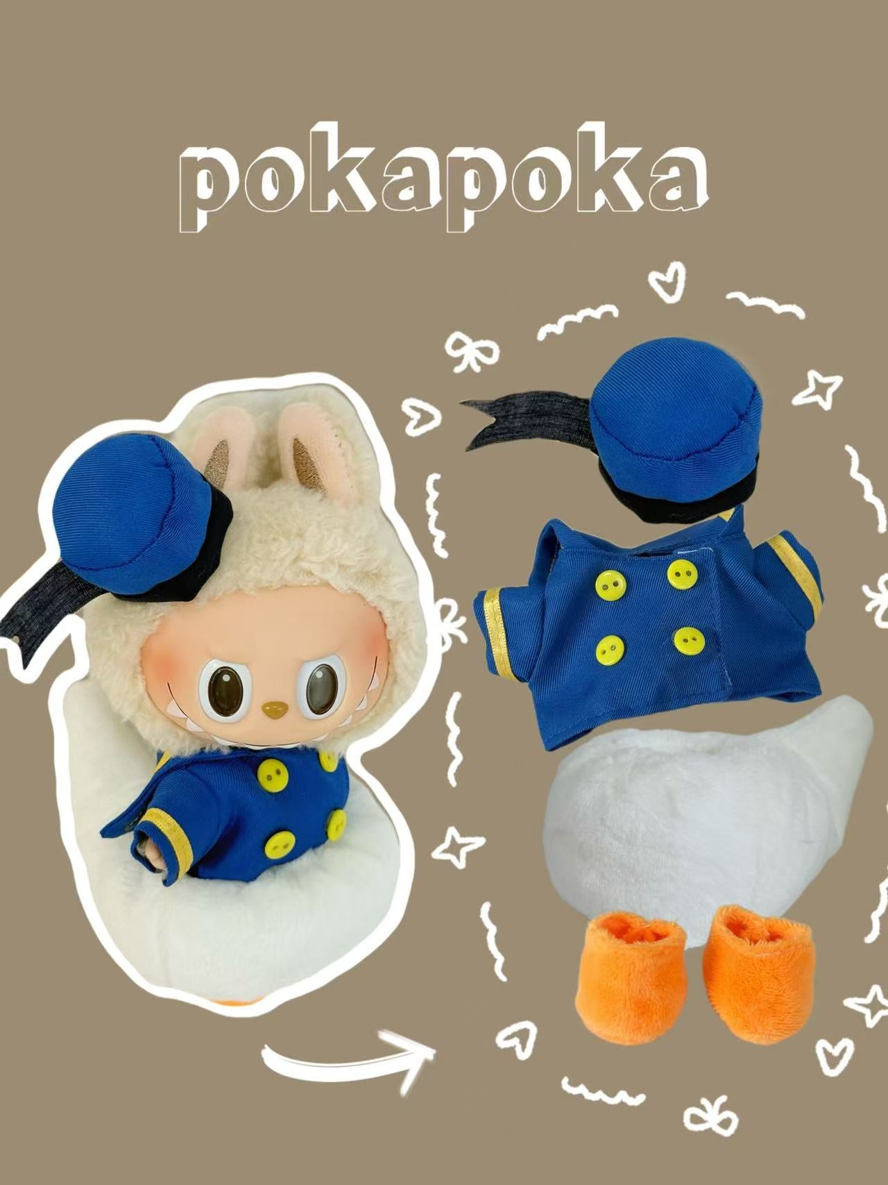 This adorable 4-piece bunny doll sailor outfit includes a soft blue round cap with ribbon, a classic double-breasted jacket with yellow buttons and gold trim, a fluffy white tail, and a pair of fuzzy orange shoes. Perfect for dolls with bunny ears or plush toys around 18cm tall.