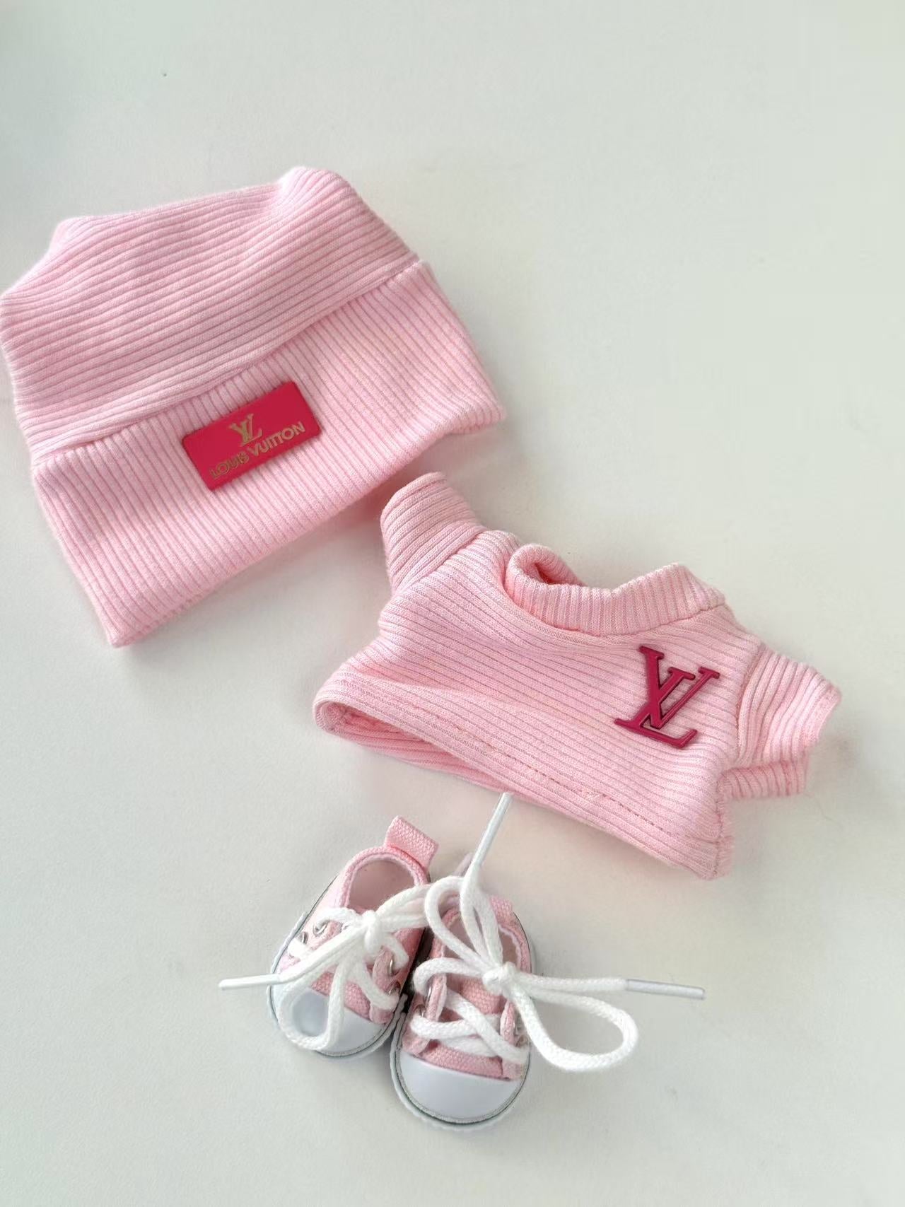 Labubu Clothes – Pink Knit Casual Outfit Set with Overalls & Bow (Handmade Soft Look)