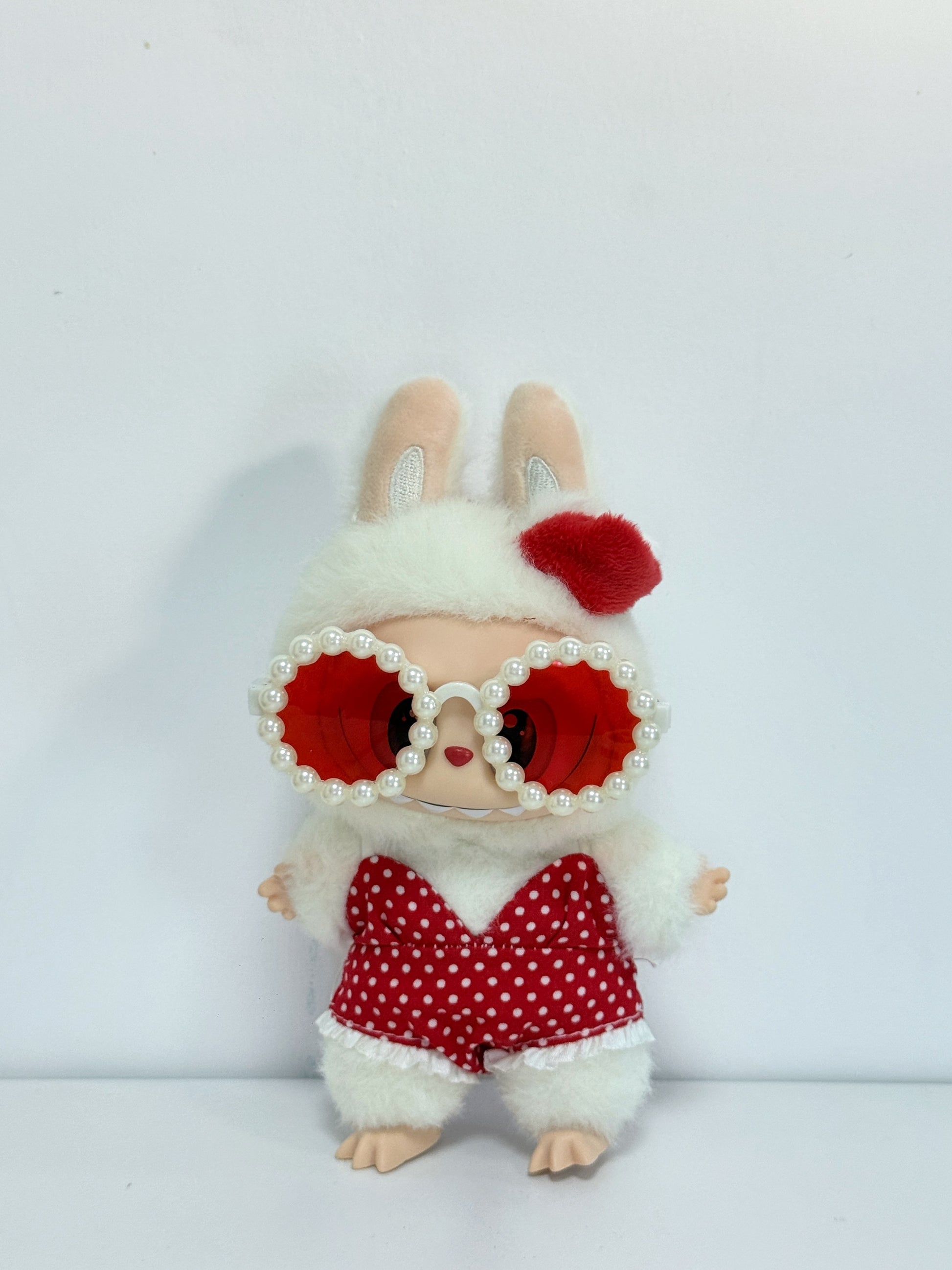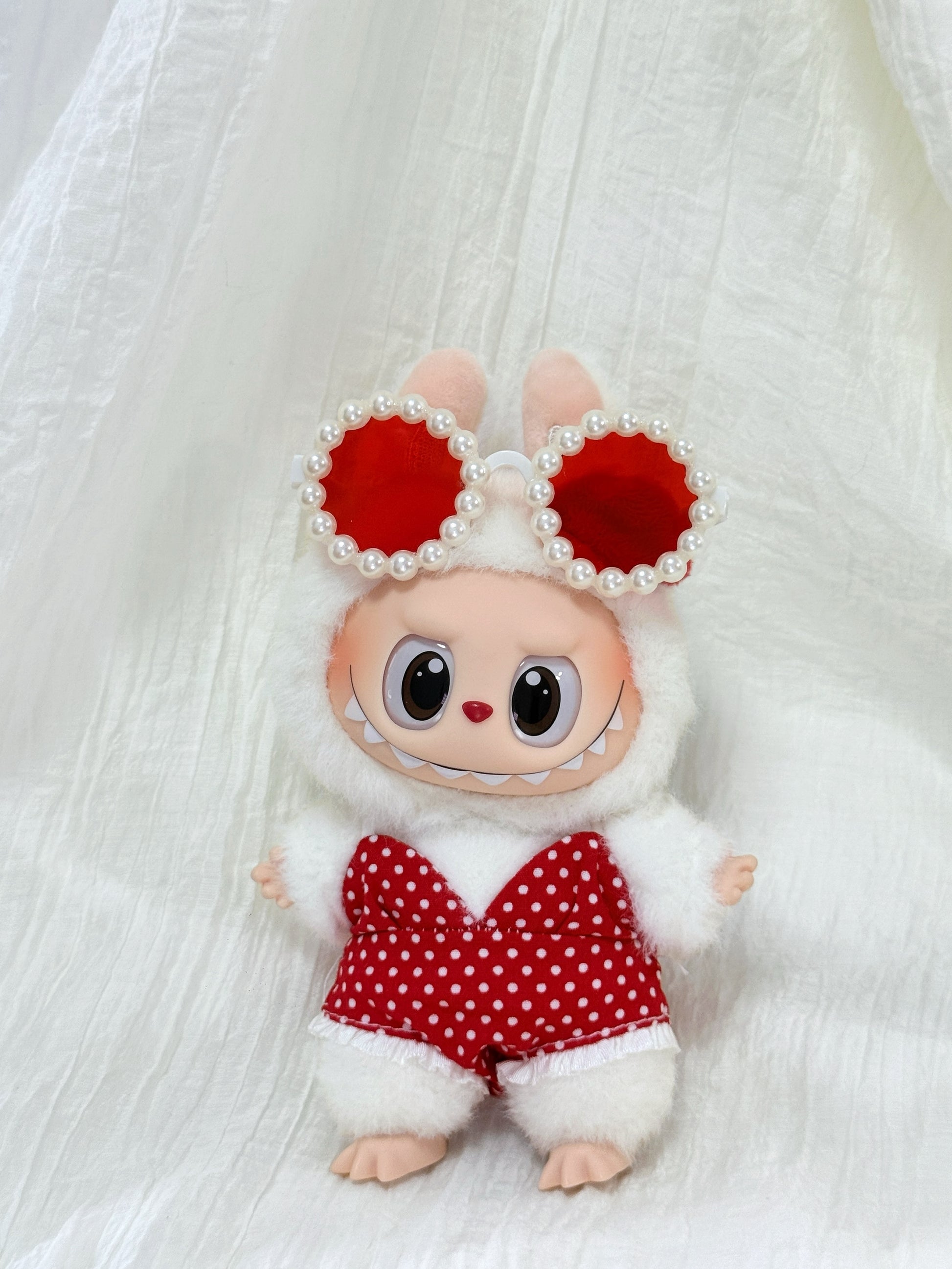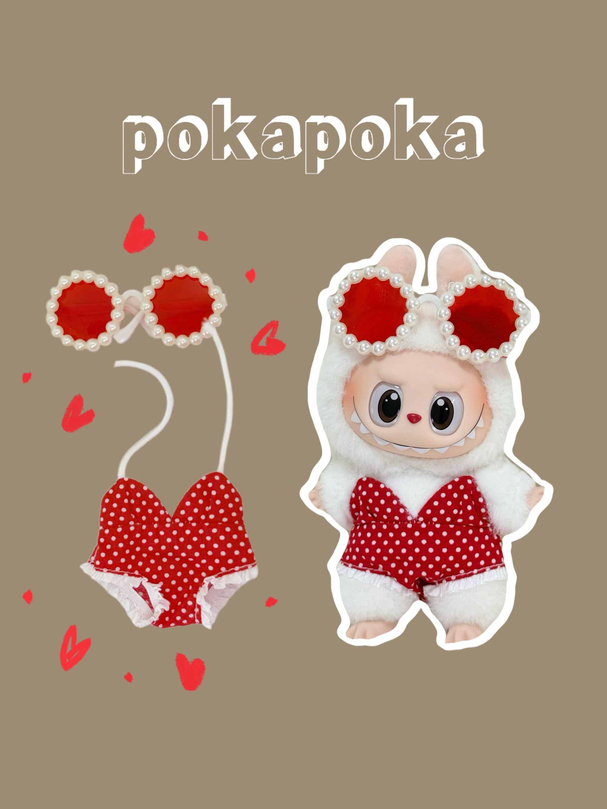 Labubu Clothes – Retro Polka Dot Swimsuit Set with Pearl Sunglasses (Handmade Summer Look)