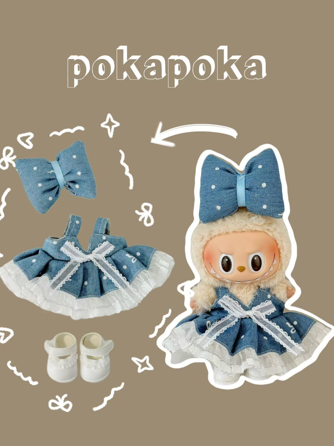 This delightful poka poka doll outfit features a sweet denim dress accented with delicate lace and a matching oversized bow headband, paired perfectly with dainty white doll shoes. Ideal for daily styling, doll photography, or gifting!