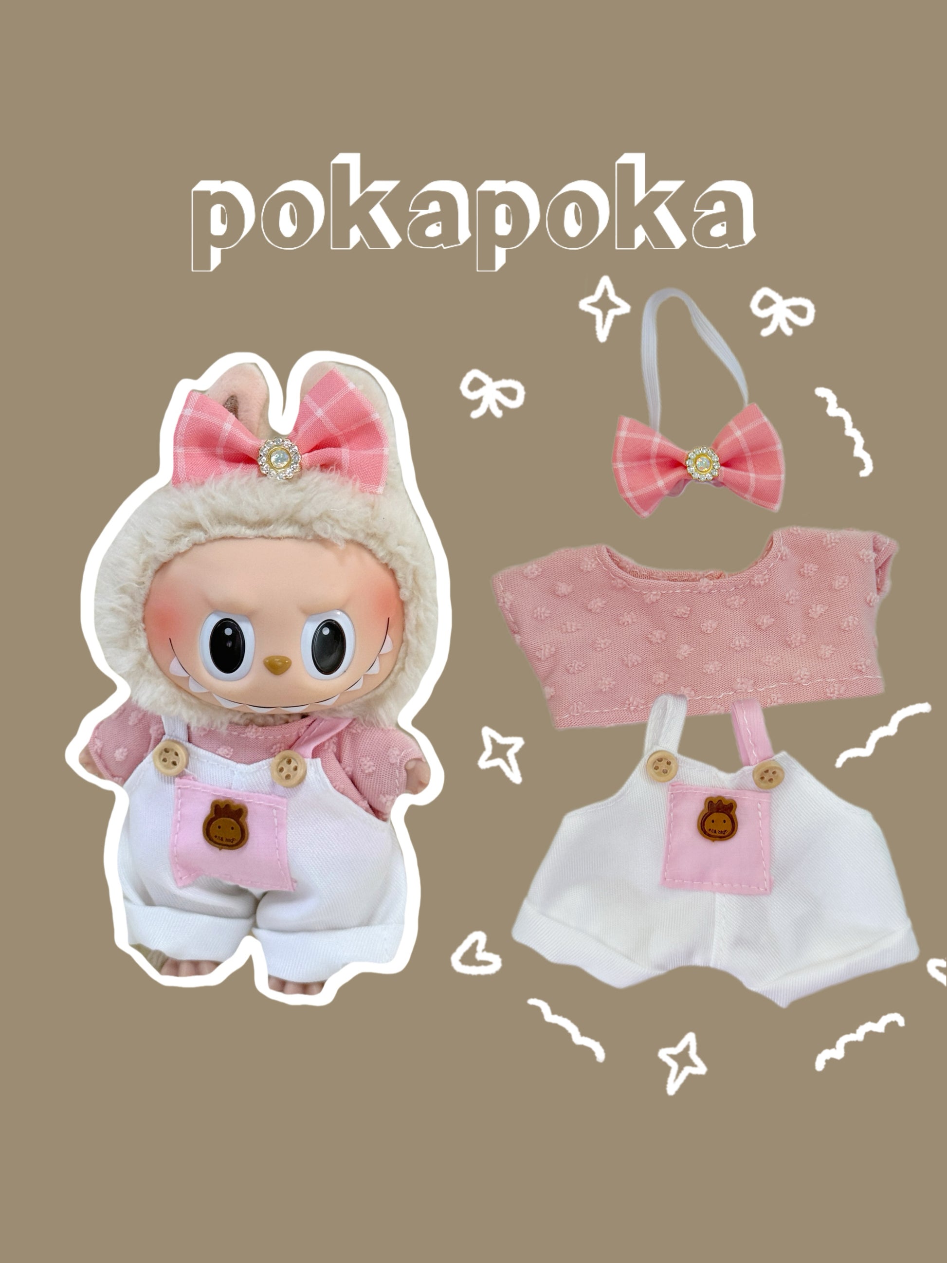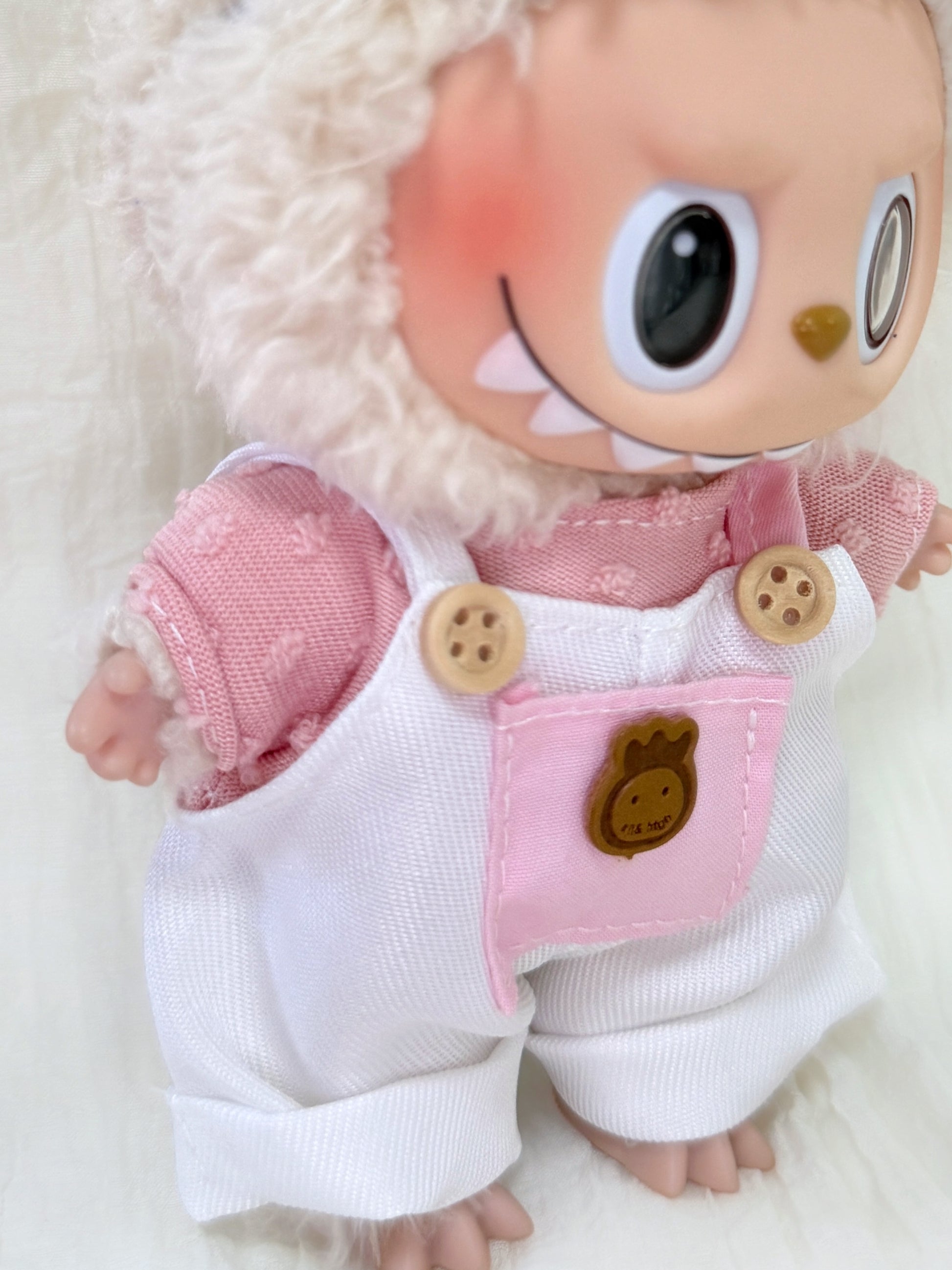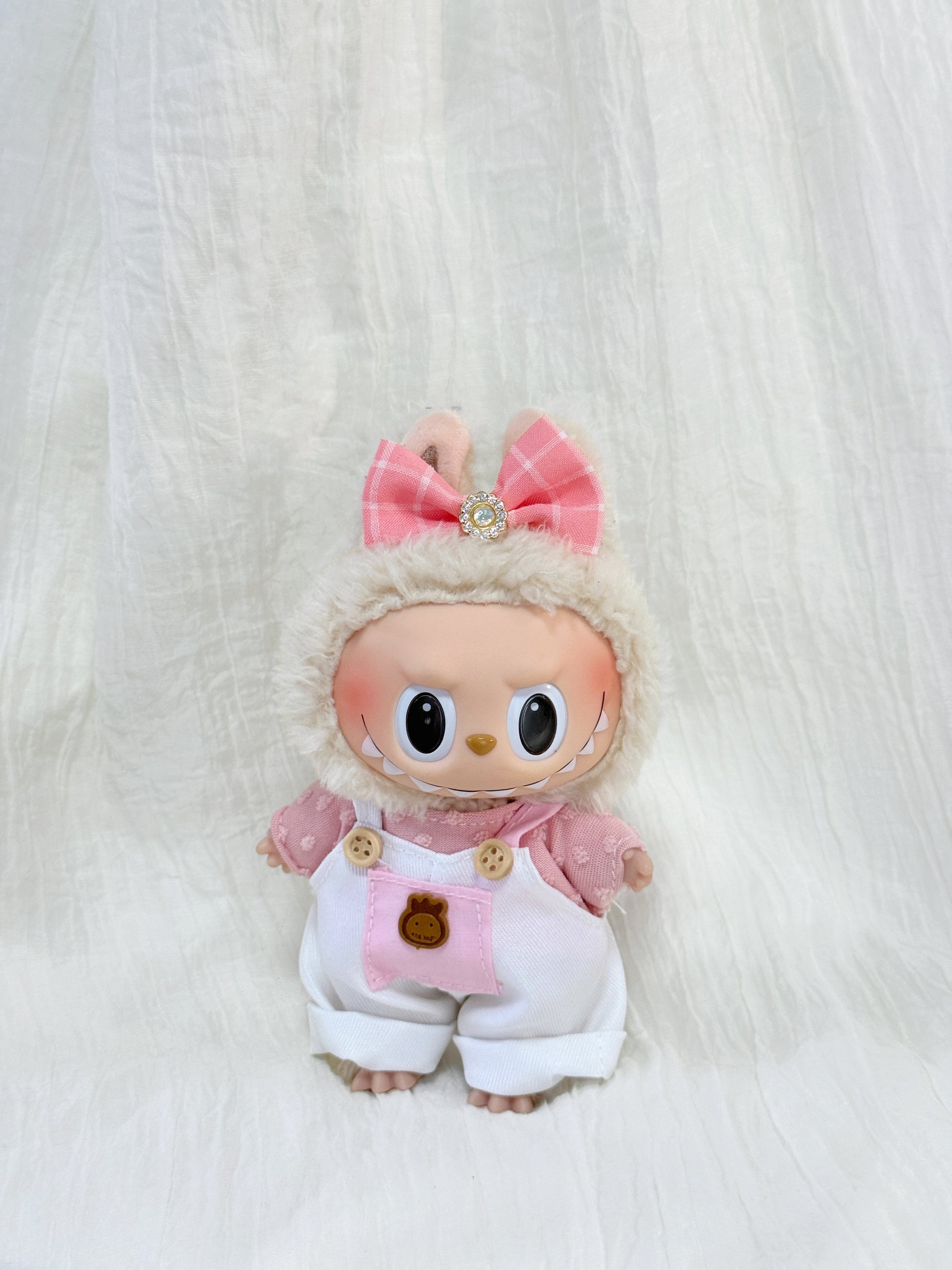 Labubu Clothes – Sweet Pink Overalls Set with Bow Headband (Handmade)